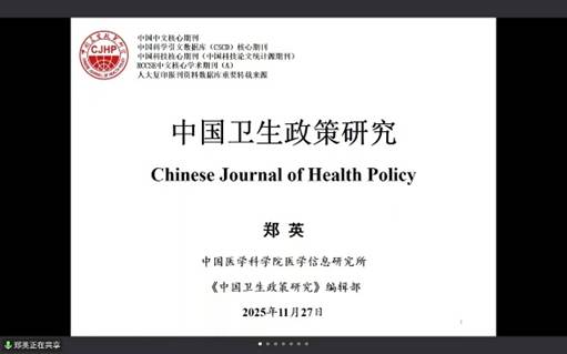 2025年11月27日下午,广东药科大学医药商学院香山学术沙龙第十一期在线上成功举办。本次讲座以“卫生政策研究热点与论文”为主题,特邀《中国卫生政策研究》编辑部主任、中国医学科学院医学信息研究所郑英研究员担任主讲人。活动通过腾讯会议平台进行,吸引了校内外师生、科研工作者及卫生政策相关领域同仁在线参与。